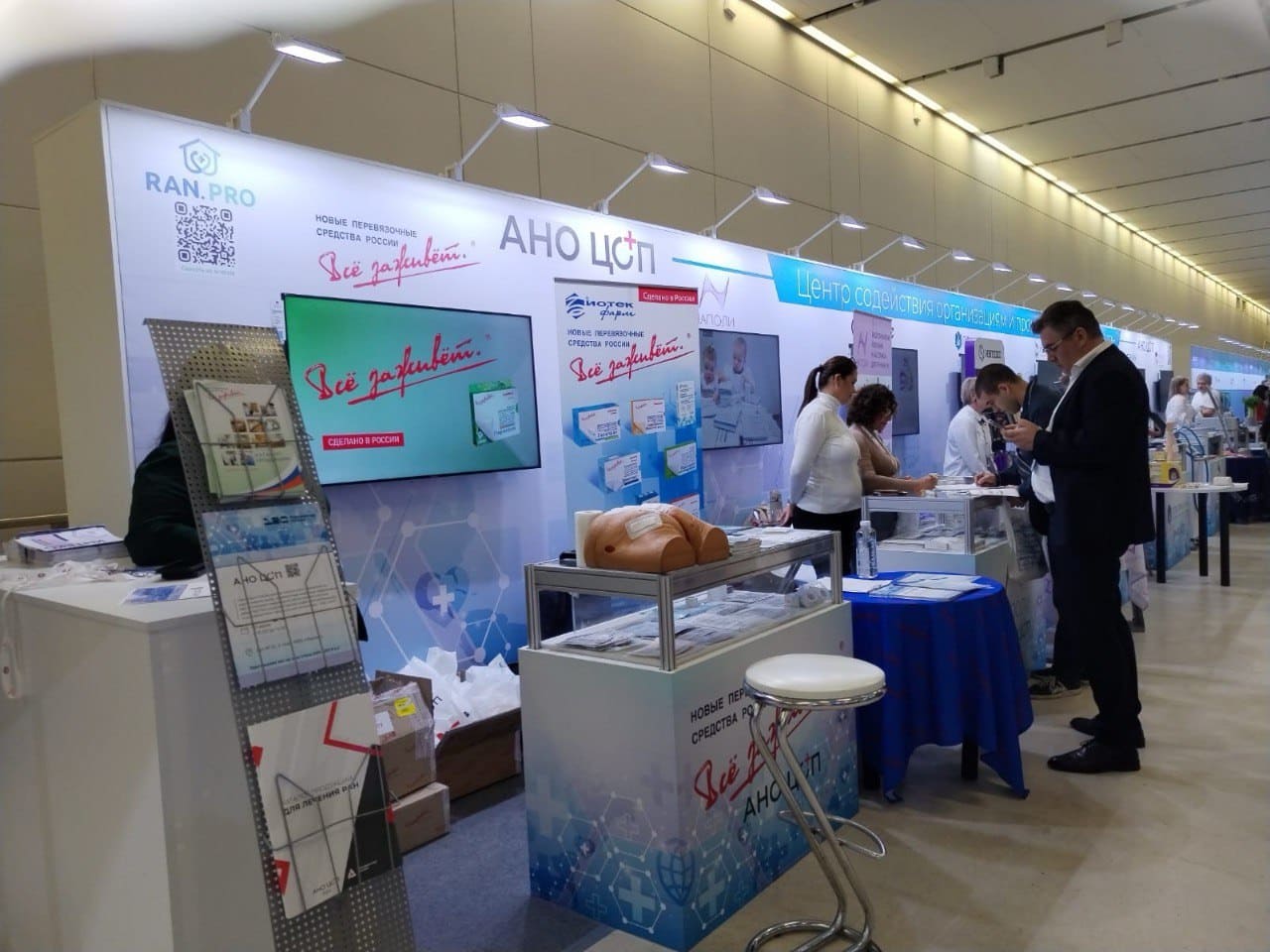 Компании-участницы АНО «ЦОП» показали на стенде разнообразные медицинские изделия. «Биотекфарм» и «Наполи» продемонстрировали заживляющие и хитозановые повязки, гидрогелевые покрытия, пластыри и полимерные изделия для хирургии, гемостатические губки. Посетители познакомились с продукцией компании «Карипаин» для лечения, коррекции и профилактики рубцов, шрамов, контрактур и последствий ожогов. «Плазмопром» показала уникальную плазменную установку «Плазморан» для лечения ран. «Интерлин» и «Интекс» представили бандажи, корсеты и эластичные бинты для восстановления после травм. Внимание привлекли интеллектуальные электрохирургические системы и кавитационные аппараты от «Фотек».